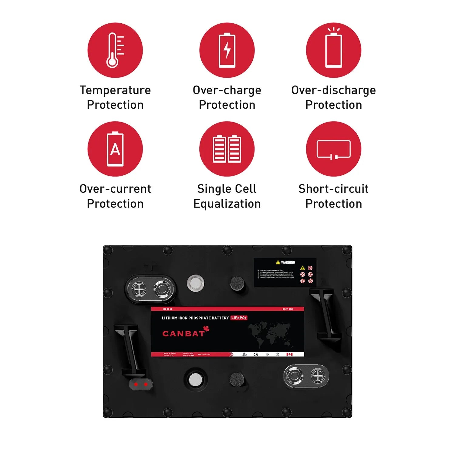 The Canbat GC2-30-48 is a 48V 30Ah deep cycle golf cart lithium battery featuring advanced LiFePO4 technology and standard M8 terminals. The battery is engineered specifically for golf carts and delivers high-quality performance, scalable power, and unmatched precision. This Canbat GC2 golf cart battery will help you play longer with twice the run time compared to traditional GC2 golf batteries. They last 5 times longer and provide exceptional lifetime value. No maintenance or watering is ever required. The battery can be installed in any orientation and can charge ten times faster than lead acid, giving you more time on the course. The GC2-30-48 also helps you significantly cut down weight, which is a quarter the weight of a standard GC2 battery.