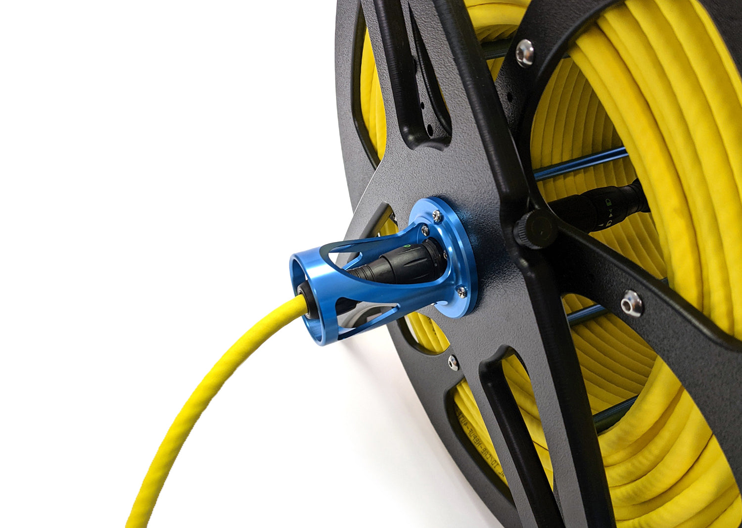 The Fathom Spool comes as a partially-assembled kit with some simple assembly required. It has a Binder 770 connector on both the inside and outside of the spool so that to install the tether, you just plug it into the inner Binder 770 connector, attach a few restraints, and start spooling! An included 8 meter (26 ft) extension cable provides a connection from the outer connector on the spool to your FXTI and computer.