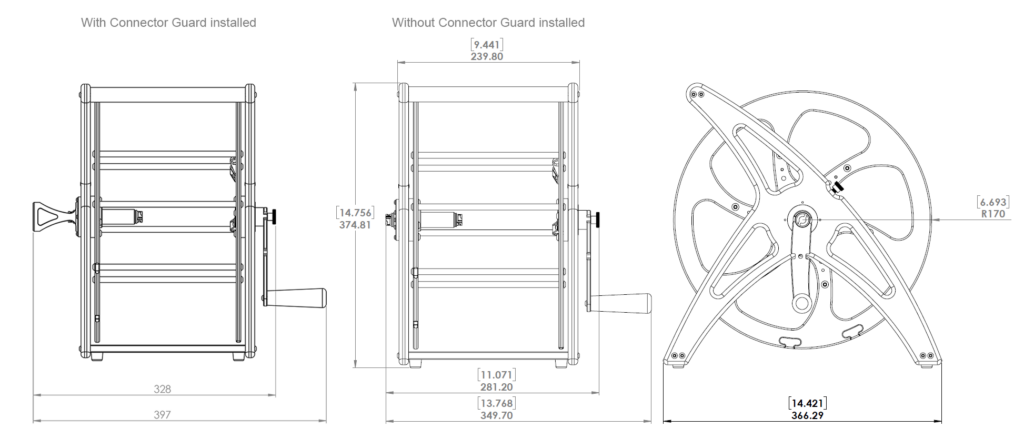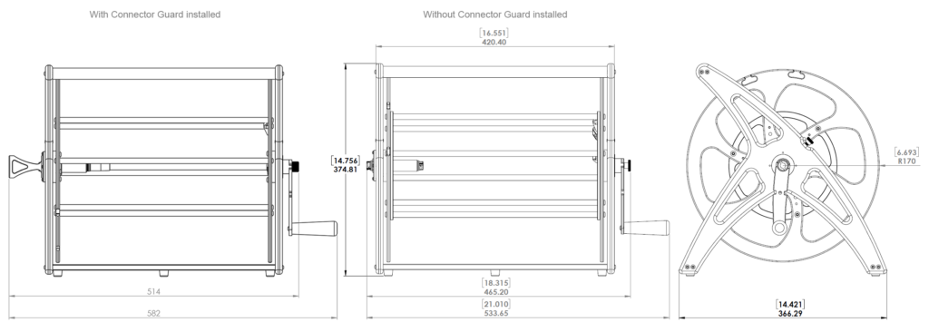 The crank handle can be removed with a single thumb screw, allowing it to be flipped around and reinstalled for easy transportation and locking of the spool.